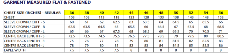 Slim fit, 2 button front, centre vent, 2 flap pockets, welt chest pocket, 2 internal pockets, notch lapel.